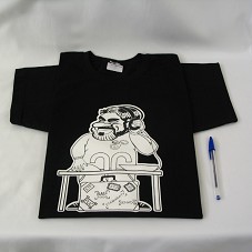 CAMISETA (TAM GG) EM MALHA PRETA, DE MANGA CURTA. NA FRENTE, ESTAMPA COM CARICATURA DO PRESIDENTE LULA AGINDO COMO DJ, VESTINDO CAMISA COM LOGOMARCA DO BRASILIA MUSIC FESTIVAL - BMF. NA MESA DE SOM, O CONGRESSO ESTILIZADO; E, ABAIXO DELA, UMA MALA FECHADA. ATRÁS, EM BRANCO, 'EXCURSÃO BRASÍLIA 2005 / DIREITO-LONDRINA'.