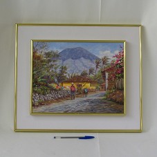 QUADRO EMOLDURANDO PINTURA SOBRE TELA (34,5X26,2 CM) RETRATANDO, AO FUNDO, UM VULCÃO; E, EM PRIMEIRO PLANO, HOMEM PUXANDO UM BURRO POR UMA ESTRADA, COM DIVERSAS CASAS AO FUNDO E VEGETAÇÕES. PREDOMINA OS TONS DE AZUL, MARROM E VERDE. NO CANTO INFERIOR DIREITO, ASSINATURA DO ARTISTA, 'MAZARIEGOS / 05'. MOLDURA EM LAMINADO METÁLICO DOURADO. PINTURA FIXADA EM SEGUNDA MOLDURA, DE MESMO MATERIAL, SERVINDO DE PASSE-PARTOU, EM PAPEL BRANCO. ATRÁS, PAPEL COLADO COM INFORMAÇÕES SOBRE O ARTISTA E OUTRO COM DESCRIÇÃO DA OBRA: 'VOLCAN CHINGO / TÉCNICA: OLEO / MEDIDA: 11X14' / CÓDIGO N. 2114 / OBRA ORIGINAL DE JORGE MAZARIEGOS RODRÍGUEZ', ASSINADA PELO MESMO.