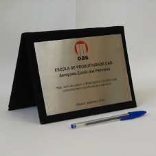 PLACA EM METAL PRATEADO ESCOVADO, COLADA EM PASTA ENVELOPE, FORRADA DE VELUDO PRETO. POSSUI A INSCRIÇÃO 'ESCOLA DE PRODUTIVIDADE OAS / AEROPORTO ZUMBI DOS PALMARES / HOJE, COM SEU APOIO, O BRASIL GANHA CIDADÃOS QUE CONCRETIZARAM O SONHO DE LER E ESCREVER. / MACEIÓ, SETEMBRO 2005'. POSSUI O SÍMBOLO DA CONSTRUTORA OAS.