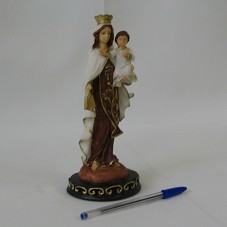 ESCULTURA (8X6X19 CM) EM RESINA, IMAGEM DE NOSSA SENHORA DO CARMO, SEGURANDO UMA CRIANÇA NO COLO E, NA OUTRA MÃO, DOIS ESCAPULÁRIOS. TÚNICA NA COR MARROM, COM DETALHES DOURADOS; E MANTO BRANCO COM DETALHES DOURADOS. POSSUI UMA COROA. BASE (9X8X2 CM) PRETA COM ARABESCOS DOURADOS.