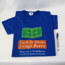 CAMISETA (TAM M) EM MALHA AZUL MARINHO, DE MANGA CURTA. NA FRENTE, ESTAMPA EM VERDE E LARANJA, DESENHO DE UM CAMPO DE FUTEBOL DISTORCIDO EM FORMA DE LIVRO E 'ESCOLA DE FÁBRICA UNISYS ARENA / ESPORTE E CIDADANIA / UM PROJETO DO MINISTÉRIO DA EDUCAÇÃO'. ATRÁS, LOGOMARCAS DAS INSTITUIÇÕES PARTICIPANTES.