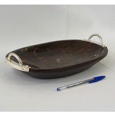 BANDEJA(30,5X19,5X4 CM) EM MADEIRA ESCURA, COM TONALIDADE AVERMELHADA. POSSUI ALÇAS EM PRATA 925, E PARTE SUPERIOR CRAQUELADA, PARECENDO UM MOSAICO DE MADEIRA COM REJUNTES ROXEADOS, SELADA E ENVERNIZADA. NO FUNDO EXTERNO DA BANDEJA, ETIQUETA 'ARGENTA 0.925'. ACOMPANHA CARTÃO DO REMETENTE. ACONDICIONADA EM SACO ACOLCHOADO, DE TECIDO PRETO.