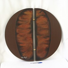 PINTURA SOBRE TELA CIRCULAR (70X70 CM), EM TONS DE MARROM, REPRESENTANDO UMA SEMENTE DE CAFÉ. POSSUI UM RECORTE NO CENTRO, SEPARANDO A TELA AO MEIO, E PINOS EM METAL DOURADO QUE FIXAM UMA PARTE À OUTRA. NO CANTO INFERIOR ESQUERDO, ASSINATURA DA ARTISTA, 'VALÉRIA VIDIGAL'. NA PARTE POSTERIOR, INORMAÇÕES SOBRE O OBJETO: ''CAFÉ GOURMET' / ÓLEO SOBRE PAINEL / 70X70 CM / 2005 / CAFÉ COM ARTE / VALÉRIA VIDIGAL'; E TELEFONES E SITE DA ARTISTA 'WWW.VALERIAVIDIGAL.COM.BR'.