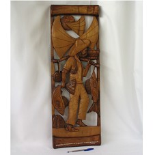 QUADRO (27,5X80,5 CM) ENTALHADO EM MADEIRA, REPRESENTANDO UM PESCADOR CARREGANDO PEIXES, COM JANGADAS AO FUNDO. NA BASE, A INSCRIÇÃO 'LEMBRANÇA DA FEDERAÇÃO DOS PESCADORES DA BAHIA AO PRESIDENTE LULA'.