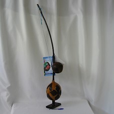 BERIMBAU (16X15X114 CM) EM MADEIRA ENTALHADA, FIXADO EM CABAÇA QUE POSSUI ENTALHES DE DESENHOS GEOMÉTRICOS; E ESTA, FIXADA EM BASE DE MADEIRA (16X9X2 CM). POSSUI FIO DE ARAME PRESO AO ARCO E DUAS FITAS DO SENHOR DO BONFIM. ACOMPANHA DOIS FOLDERS COM INFORMAÇÕES SOBRE O 'PROJETO DE DESENVOLVIMENTO DOS PEQUENOS EMPREENDIMENTOS CULTURAIS - PÓLO DE CAPOEIRA DE LAURO DE FREITAS', UMA PARCERIA COM O SEBRAE E A PREFEITURA LOCAL.