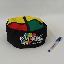 CHAPÉU EM FORMATO CIRCULAR, CONFECCIONADO EM TECIDO PRETO COM A INSCRIÇÃO 'OLODUM / BAHIA-BRASIL' NA PARTE FRONTAL. NA PARTE SUPERIOR, SÍMBOLO COM AS CORES DO OLODUM (AMARELO, VERMELHO E VERDE). POSSUI INTERIOR FORRADO EM TECIDO XADREZ.