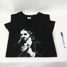 CAMISETA (TAM GG) EM MALHA PRETA, DE MANGA CURTA. NA FRENTE, ESTAMPA DE FOTOGRAFIA EM NEGATIVO, DE UM HOMEM COM CABELOS LONGOS, BARBA E BIGODE, USANDO ÓCULOS E TERNO. ATRÁS, SÍMBOLO DE UMA CRUZ EM CIMA DE UM CÍRCULO E 'SANTA / BY DARIVA'.