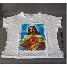 CAMISETA (TAM G) EM MALHA BRANCA, DE MANGA CURTA, TIPO BABY-LOOK. NA FRENTE, ESTAMPA COM IMAGEM DE JESUS CRISTO E UMA MOLDURA FORMADA POR RENDA BRANCA, COM DETALHES EM LANTEJOULA DOURADA.