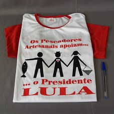 CAMISETA (TAM G) EM MALHA BRANCA, COM MANGAS CURTAS E VERMELHAS. NA FRENTE, DESENHO ESTILIZADO DE TRÊS PESSOAS DE MÃOS DADAS, E A INSCRIÇÃO 'OS PESCADORES ARTESANAIS APOIAM...O PRESIDENTE LULA'. ATRÁS, 'MARAGOJIPE / TERRA DA GENTE'.