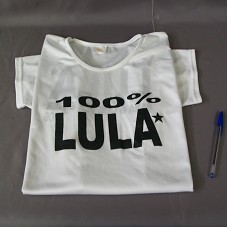 CAMISETA (TAM XG) EM MALHA BRACNA, DE MANGA CURTA. NA FRENTE, EM PRETO, '100% LULA'. ATRÁS, 'COM LULA PARA O QUE DER E VIER 2006'.