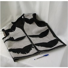 COLETE EM COURO, NA COR CINZA, COM DETALHES E FRANJAS EM PRETO. POSSUI DOIS BOLSOS INTERNAMENTE E INTERIOR FORRADO COM PELO ANIMAL.