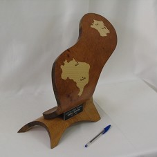 PLACA EM MADEIRA (36X14X29 CM), DE FORMATO AMEBÓIDE, CONVEXA. POSSUI O MAPA DO BRASIL E DA FRANÇA, EM MADEIRA MAIS CLARA. FIXADA EM BASE (32,5X15X5 CM) DE MESMO MATERIAL, TAMBÉM CONVEXA, ONDE, NA PARTE FRONTAL HÁ UMA PLACA COM A INSCRIÇÃO 'COOPERATION CFR BRESIL-MFR FRANCE / DONNER / RECEBOIR / 1999-2005'; E, ATRÁS, OUTRA PLACA COM A INSCRIÇÃO 'REALISÉ PAR LES ÉLÈVES B. P 2005 / M.F.R. LE CHALET / ST ANDRÉ LE GAZ (ISÈRE) - FRANCE'.