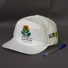 BONÉ EM BRIM BRANCO, ACOLCHOADO. NA FRENTE, ESTAMPA COM DESENHO ESTILIZADO DE UMA FLOR E 'PROJETO DOM HELDER CAMARA'. NAS LATERAIS, LOGOMARCA DO GOVERNO FEDERAL E DA FIDA - 'FUNDO INTERNACIONAL PARA O DESENVOLVIMENTO DA AGRICULTURA'.