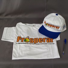 CAMISETA (TAM GG) EM MALHA BRANCA, DE MANGA CURTA. NA FRENTE, ESTAMPA EM LARANJA E PRETO, COM A INSCRIÇÃO 'PROSPERAR / A AGROINDÚSTRIA FAMILIAR DESENVOLVENDO O INTERIOR'. ATRÁS, EM AZUL E VERMELHO, 'SECRETARIA DE ESTADO DE AGRICULTURA, ABASTECIMENTO, PESCA E DESENVOLVIMENTO DO INTERIOR / GOVERNO DO ESTADO DO RIO DE JANEIRO'. ACOMPANHA BONÉ EM BRIM BRANCO, COM ABA AZUL, CONTENDO MESMA ESTAMPA.