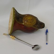 CUIA DE CHIMARRÃO (16X16X21 CM) DECORADA COM DUREPOX MODELADA, PINTADA E ENVERNIZADA, TENDO NA FRENTE, UM BRASÃO COM DESENHO DE UM CAVALO. ACOMPANHA UMA BOMBA EM METAL PRATEADO, COM DETALHES DOURADOS E TRÊS PEDRAS VERMELHAS INCRUSTADAS.