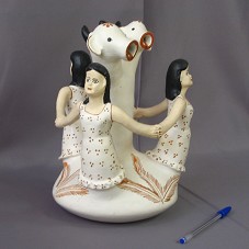 ESCULTURA EM ARGILA (18X18X27 CM), MOSTRANDO TRÊS MULHERES DE MÃOS DADAS, FORMANDO UM CÍRCULO, UMA DE COSTAS PARA A OUTRA; NO CENTRO, FIGURA DE UM TRONCO, TENDO NA PARTE SUPERIOR, DUAS CABEÇAS DE GADO. BASE CIRCULAR, COM A INSCRIÇÃO 'AO COMPANHEIRO LULA / CONTAG - 29.09.05'. PINTADA EM TONS DE BEGE E MARROM. OBJETO ENCONTRA-SE UM POUCO CRAQUELADO. NO FUNDO DA BASE, ESCRITO A GRAFITE, 'CLÁUDIA PEREIRA DOS SANTOS / 40,00'.