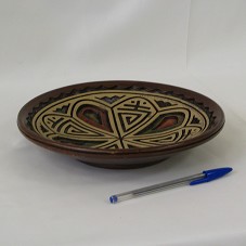 PRATO DECORATIVO, CIRCULAR (24X24X4 CM), EM CERÂMICA. POSSUI INTERIOR TRABALHADO EM BAIXO RELEVO, COM FIGURA ESTILIZADA DE UMA FLOR, COM DESENHOS GEOMÉTRICOS, NAS CORES MARROM, VERDE E VERMELHA. POSSUI A INSCRIÇÃO, À CANETA PILOT, 'II FEIRA NACIONAL DA AGRICULTURA FAMILIAR E REFORMA AGRÁRIA - 29.09.05 / CONTAG-BRASÍLIA/DF'. ATRÁS, GACHO PARA FIXAÇÃO EM PAREDE E 'AO COMPANHEIRO LULA. CONTAG 29/09/05'.