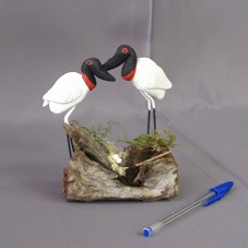 ARTESANATO (10,5X7,5X13 CM) MOSTRANDO DOIS FLAMINGOS EM CIMA DE UM PEDAÇO DE TRONCO, PROTEGENDO O NINHO COM ALGUNS OVOS. POSSUI UMA PLACA EM LÂMINA DE MADEIRA, COM A INSCRIÇÃO 'PANTANAL / CONTAG / 29.09.05'.