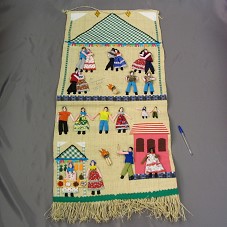 PAINEL (52X11 CM) EM PALHA, MOSTRANDO UMA ENCENAÇÃO DE FESTA CAIPIRA, COM CASAIS DANÇANDO PERTO DA FOGUEIRA, SANFONEIROS, E BARRAQUINHA. PERSONAGENS E CENÁRIO CONFECCIONADOS EM TECIDOS COLORIDOS, DE CHITA E ALGODÃO.