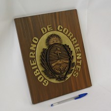 PLACA EM MADEIRA (25X30 CM), CONTENDO NO CENTRO O BRASÃO DE ARMAS DA ARGENTINA, EM MADEIRA E EM ALTO RELEVO. O BRASÃO, NO FORMATO DE UMA ELIPSE, MOSTRA O SOL NO TOPO; NA ELIPSE CENTRAL DUAS MÃOS UNIDAS SEGURANDO UMA LANÇA COM UM GORRO; E, ESSA, CIRCUNDADA POR RAMOS DE LOURO. POSSUI A INSCRIÇÃO 'GOBIERNO DE CORRIENTES'. ATRÁS, CARTÃO DE VISITA EM NOME DE 'EDGARD NICOLÁS CAZAS / CORRIENTES - ARGENTINA', COM ENDEREÇO E TELEFONE. ACONDICIONADA EM CAIXA VERDE COM ETIQUETAL 'PARA EL SEÑOR PRESIDENTE DE BRASIL LULA DA SILVA'.