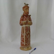 ESCULTURA (13X11,5X48,5 CM) EM ARGILA, IMAGEM DE SÃO FRANCISCO DE ASSIS, COM POMBOS EM SUAS MÃOS, OMBRO E CABEÇA. ESCULTURA EM TONS DE MARROM E BEGE. NA BASE, A INSCRIÇÃO 'GERAR 98 BARRA'.