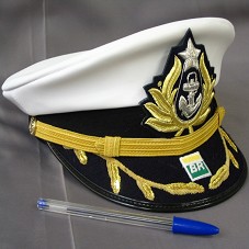 QUEPE DE COMANDANTE DA MARINHA, EM TECIDO BRANCO, COM ABA PRETA E DETALHES DOURADOS, COM A LOGOMARCA DA PETROBRÁS. NA FRENTE, O SÍMBOLO DA MARINHA DO BRASIL. ACOMPANHA CARTÃO COM AS INSCRIÇÕES ' PARA UM BRASILEIRO QUE COLOCOU NA CABEÇA QUE ESSE PAÍS PODE IR MUITO LONGE. BEM-VINDO A BORDO, COMANDANTE LULA'.