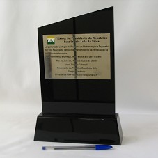 PLACA (15X10 CM) EM METAL PRATEADO PRESA À BASE (20X30X6 CM) DE ACRÍLICO PRETO. POSSUI A LOGOMARCA DA PETROBRÁS, E A INSCRIÇÃO 'EXMO. SR. PRESIDENTE DA REPÚBLICA LUIZ INÁCIO LULA DA SILVA / LANÇAMENTO DA LICITAÇÃO DO PROGRAMA DE MODERNIZAÇÃO E EXPANSÃO DA FROTA NACIONAL DE PETROLEIROS: MARCO HISTÓRICO DA REVITALIZAÇÃO DA INDÚSTRIA NAVAL BRASILEIRA. / DESENVOLVIMENTO, EMPREGOS, RENDA E SOBERANIA PARA O BRASIL. / RIO DE JANEIRO, 10 DE OUTRUBRO DE 2005 / JOSÉ SÉRGIO GABRIELLI / PRESIDENTE DA PETRÓLEO BRASILEIRO S/A / SÉRGIO MACHADO / PRESIDENTE DA PETROBRÁS TRANSPORTE S/A'.