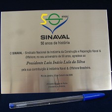 PLACA (19X14 CM) EM METAL PRATEADO. POSSUI A LOGOMARCA DE 50 ANOS DA SINAVAL, E A INSCRIÇÃO 'SINAVAL / 50 ANOS DE HISTÓRIA / O SINAVAL - SINDICATO NACIONAL DA INDÚSTRIA DA CONSTRUÇÃO E REPARAÇÃO NAVAL & OFFSHORE, NO SEU ANIVERSÁRIO DE 50 ANOS, AGRADECE AO PRESIDENTE LUIZ INÁCIO LULA DA SILVA / PELA SUA CONTRIBUIÇÃO À INDÚSTRIA NAVAL & OFFSHORE BRASILEIRA. / RIO DE JANEIRO, 10 DE OUTUBRO DE 2005 / ARIOVALDO SANTANA ROCHA / PRESIDENTE DO SINAVAL'. ACONDICIONADA EM UM ESTOJO AZUL (23X18X3 CM).
