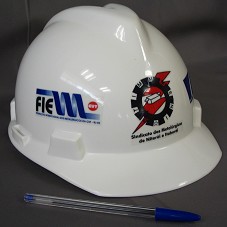 CAPACETE DE PROTEÇÃO, NA COR BRANCA. NA FRENTE, LOGOMARCA DO SINDICATO DOS METALÚRGICOS DE NITERÓI E ITABORÁI. NAS LATERAIS, LOGOMARCAS DA CONFEDERAÇÃO NACIONAL DOS METALÚRGICOS E FEDERAÇÃO INTERESTADUAL DOS METALÚRGICOS DA CUT - RJ-ES. ATRÁS, A BANDEIRA NACIONAL E A INSCRIÇÃO 'PRESIDENTE: LULA'.
