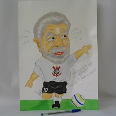 DESENHO CARICATURADO (30X42 CM)DO PRESIDENTE LUIZ INÁCIO LULA DA SILVA, COM O UNIFORME DO CORINTHIANS, CHUTANDO UMA BOLA DE FUTEBOL. CONFECCIONADO EM PAPEL CANSON NA COR CREME, USANDO GRAFITE, LÁPIS DE COR, AQUARELA E CANETA HIDROCOR. NA PARTE INFERIOR ESQUERDA A ASSINATURA DO ARTISTA; E, NA DIREITA, A INSCRIÇÃO 'AO PRESIDENTE LULA COM CARINHO / QUE DEUS TE ILUMINE SEMPRE'