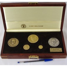 TRÊS MOEDAS (50 MM DE DIÂMETRO CADA) EM OURO (750, 60GR), PRATA (925, 60 GR) E BRONZE, CADA; E DUAS MENORES (28 E 19 MM CADA) EM OURO. TODAS POSSUEM O MESMO DESENHO: NO ANVERSO, EFÍGIE DO PRESIDENTE LUIZ INÁCIO LULA DA SILVA E A INSCRIÇÃO 'HIS EXCELLENCY LUIZ INÁCIO LULA DA SILVA / PRESIDENT OF THE FEDERATIVE REPUBLIC OF BRAZIL / FAO / ROME', E ASSINATURA DO ARTISTA, 'S. GIRLANDA'. NO REVERSO, A INSCRIÇÃO 'SE, AO FINAL DO MEU MANDATO, TODOS OS BRASILEIROS TIVEREM A POSSIBILIDADE DE TOMAR CAFÉ DA MANHÃ, ALMOÇAR E JANTAR, TEREI CUMPRIDO A MISSÃO DA MINHA VIDA'. ACONDICIONADAS EM ESTOJO DE MADEIRA (28X14X5 CM) COM DETALHES EM METAL DOURADO E ACOBREADO, POSSUINDO, NA TAMPA, O SÍMBOLO DA FAO. INTERNAMENTE, PLACA COM A INSCRIÇÃO 'WITH THE COMPLIMENTS OF JACQUES DIOUF / DIRECTOR-GENERAL OF FAO'. ACOMPANHA CERTIFICADO DE GARANTIA; FAZENDO PARTE DE SÉRIE LIMITADA E NUMERADA, TODAS DE NUMERAÇÃO '01'.