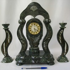 RELÓGIO ANALÓGICO CIRCULAR (8X8 CM), COM FRISO DOURADO E NUMERAÇÃO ROMANA. INCRUSTADO EM BASE (27X18X40,5 CM) DE GRANITO ESVERDEADO, TRABALHADA COM ARCOS E COLUNAS, FORMANDO MOLDURA NA PEÇA CENTRAL. ACOMPANHA DOIS CASTIÇAIS (8X8X26,5 CM CADA), EM MESMO MATERIAL, TRABALHADOS DA MESMA MANEIRA. ACONDICIONADOS EM CAIXA FORRADA DE VELUDO MARROM COM FECHOS DOURADOS.