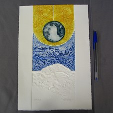GRAVURA (3X23 CM) EM PAPEL 'ARCHÉS' 250 GR, NA COR BEGE, DE NUMERAÇÃO 44/150, ASSINADA PELO ARTISTA 'PORTILLA'. POSSUI GLOBO MUNDI EM TONS DE VERDE E PRETO, NO CENTRO SUPERIOR, SOBRE FUNDO AMARELO TEXTURIZADO; NA PARTE INFERIOR, EM AZUL, 'ENCUENTRO DE SENTIMENTOS'; E, LOGO ABAIXO, EM BAIXO RELEVO, DESENHO NÃO IDENTIFICADO. ACONDICIONADO ENTRE PAPEL VEGETAL.