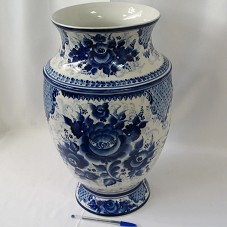 VASO/JARRO (24,5X44 CM) DECORATIVO EM PORCELANA BRANCA, DECORADO À MÃO COM PINTURA EM TONS DE AZUL DE MOTIVOS FLORAIS. POSSUI BOJO MAIS ABAULADO NA PARTE CENTRAL SUPERIOR, AFUNILANDO NA BOCA E NA BASE. NO FUNDO DESTA, BRASÃO E INSCRIÇÃO (NÃO IDENTIFICADA). ACONDICIONADO EM CAIXA DE PAPELÃO, NA COR AZUL CLARA, COM FOTOGRAFIA DO OBJETO E A INSCRIÇÃO 'GZHEL DECORATED BY HAND'.
