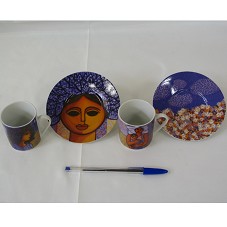 CONJUNTO DE DUAS XÍCARAS E PIRES PARA CAFÉ, EM CERÂMICA BRANCA. AS XÍCARAS POSSUEM TODA A PARTE EXTERNA PINTADA, COM DESENHOS DE CÁNDIDO BIDÓ. UMA MOSTRA A MÃE ABRAÇADA AO FILHO, FAZENDO CONJUNTO COM PIRES, ONDE HÁ O ROSTO DA MÃE PINTADO; A OUTRA, UMA MULHER, DE PERFIL, COM DIVERSAS FOLHAS EM VOLTA DO CABELO E DUAS POMBAS NA LATERAL, E O PIRES COM PINTURA DE FLORES. EM AMBOS PREDOMINAM OS TONS DE LILÁS, AZUL E MARROM. ACOMPANHA FOLHETO COM INFORMAÇÕES SOBRE O AUTOR E AS PEÇAS. ACONDICIONADO EM CAIXA DE PAPELÃO (37X16X6 CM) COM AS MESMAS PINTURAS REPRODUZIDAS NA TAMPA E A INSCRIÇÃO 'ARTE DE CAFÉ / COLECCIÓN LIMITADA / BIDO / CÁNDIDO BIDÓ / 2 TAZAS DE CAFÉ'.