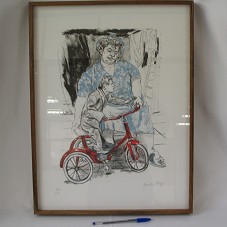 DESENHO (29X40 CM) EM PAPEL BRANCO, TIPO CANSON, FEITO EM CRAYON, LÁPIS DE CERA E HIDROCOR, EM TONS DE PRETO E GRAFITE, COM DETALHES EM AZUL E VERMELHO. RETRATA UMA SENHORA, DE VESTIDO AZUL E LENÇO NA CABEÇA, AJUDANDO UM MENINO (COM FEIÇÕES E ROUPAS DE ADULTO) A ANDAR NUM TRICICLO. COMO FUNDO, ÁREA DE UMA CASA COM ALGUMAS PEÇAS DE ROUPAS PENDURADAS. NO CANTO INFERIOR DIREITO, ASSINATURA DA ARTISTA, 'PAULA REGI'; E, NO ESQUERDO, '10/150'. COLOCADO EM MOLDURA (41,5X54,5 CM) TIPO CAIXA DE MADEIRA, COM TAMPO DE VIDRO.