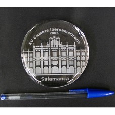 PESO DE PAPEL (9X0,6 CM) DE FORMATO CIRCULAR, CONFECCIONADO EM CRISTAL. POSSUI A FACHADA DE UMA CONSTRUÇÃO JATEADA NA FRENTE E A INSCRIÇÃO 'XV CUMBRE IBEROAMERICANA 2005 / SALAMANCA'. ACOMPANHA FOLHETO DO FABRICANTE, COM INFORMAÇÕES SOBRE OBJETO. ACONDICIONADO EM CAIXA DE PAPELÃO AZUL MARINHO, TENDO NA TAMPA, EM DOURADO, A INSCRIÇÃO 'XV CUMBRE IBEROAMERICANA' E LOGOMARCA.