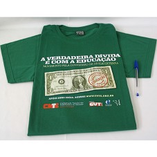 CAMISETA (TAM G) EM MALHA VERDE, DE MANGA CURTA. NA FRENTE A INSCRIÇÃO 'A VERDADEIRA DÍVIDA É COM A EDUCAÇÃO / MOVIMENTO PELA CONVERSÃO DA DÍVIDA EXTERNA', E ESTAMPA DA NOTA DE UM DÓLAR COM UM CARIMBO 'RECURSOS PARA EDUCAÇÃO DO BRASIL' E AS MARCAS DA CNTE, CUT, INTERNACIONAL DA EDUCAÇÃO E CEA.