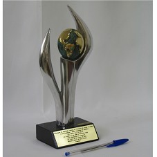 ESCULTURA EM BRONZE E ALUMÍNIO, FORMATO DE UM GANCHO OU UMA MÃO SEGURANDO O GLOBO MUNDI. FIXADA EM BASE TRAPEZOIDAL DE MÁRMORE PRETO (10X6X3 CM), COM PLACA DOURADA NA FRENTE, CONTENDO A INSCRIÇÃO 'HOMENAGEM DA ASSOCIAÇÃO NACIONAL DO TRANSPORTE DE CARGAS E LOGÍSTICA A SUA EXCELÊNCIA O SENHOR PRESIDENTE DA REPÚBLICA, LUIZ INÁCIO LULA DA SILVA, POR OCASIÃO DE SUA VISITA À FENATRAN 2005 / SALÃO INTERNACIONAL DO TRANSPORTE, SÃO PAULO, 23 DE OUTUBRO DE 2005 / GERALDO AGUIAR DE BRITO VIANNA / PRESIDENTE'. NA PARTE INFERIOR DA BASE, CERTIFICADO DE AUTENTICIDADE DA OBRA E ETIQUETA COM CURRÍCULO DA ARTISTA. ACONDICIONADA EM CAIXA DE MADEIRA, COM TAMPO DE VIDRO E FECHO DOURADO.