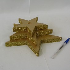 TRÊS CANDELABROS EM FORMATO DE ESTRELAS, DE TAMANHOS DIFERENTES (14X14X2, 17X17X2 E 21X21X2 CM). PINTADOS DE DOURADO COM PURPURINA DA MESMA COR NAS LATERAIS. ACOMPANHA FOLDER 'O FUTURO TEM JEITO. SÓ DEPENDE DE VOCÊ. LAR SOCIAL GIRASSOL', COM INFORMAÇÕES SOBRE A INSTITUIÇÃO.
