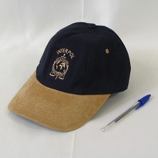 BONÉ EM BRIM AVELUDADO AZUL MARINHO, COM ABA EM CAMURÇA OCRE. NA FRENTE, BORDADO NA MESMA COR, 'INTERPOL' E LOGOMARCA.