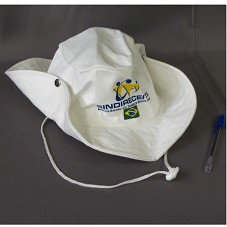 CHAPÉU TIPO AUSTRALIANO, EM BRIM BRANCO. NA FRENTE, ESTAMPADO EM AZUL, AMARELO E VERDE, 'SINDIRECEITA / SINDICATO NACIONAL DOS TÉCNICOS DA RECEITA FEDERAL', COM LOGOMARCA E BANDEIRA DO BRASIL.