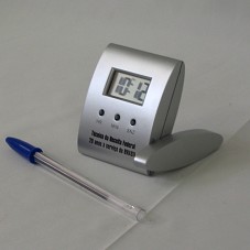 RELÓGIO DIGITAL (7X7,5X2 CM) DE MESA EM PLÁSTICO PRATEADO, IMITANDO METAL. NA FRENTE, A INSCRIÇÃO 'TÉCNICO DA RECEITA FEDERAL / 20 ANOS A SERVIÇO DO BRASIL'. ACONDICIONADO EM CAIXA DE PAPELÃO PRATEADA.