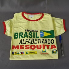 CAMISETA (TAM M) EM MALHA AMARELA, DE MANGA CURTA, COM DETALHES VERMELHOS NA GOLA E NAS MANGAS. NA FRENTE, ESTAMPA COM A INSCRIÇÃO 'PROGRAMA BRASIL ALFABETIZADO MESQUITA / GOVERNO FEDERAL / EDUCAÇÃO MINISTÉRIO DA EDUCAÇÃO / PREFEITURA MUNICIPAL DE MESQUITA / SEMECTEL', COM LOGOMARCAS E A BANDEIRA DO BRASIL.