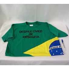 CAMISETA EM MALHA VERDE, DE MANGA CURTA. POSSUI A BANDEIRA DO BRASIL PINTADA NA LATERAL ESQUERDA, NA PARTE FRONTAL E POSTERIOR. NA FRENTE, EM PRETO, A INSCRIÇÃO 'DESFILE CÍVICO DE MESQUITA'. ATRÁS, 'PREFEITURA MUNICIPAL DE MESQUITA / GOVERNO PRESENTE / CIDADE DE TODOS' E 'PROCURADORIA PGM'.