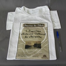 CAMISETA (TAM M) EM MALHA BRANCA, DE MANGA CURTA. NA FRENTE, ESTAMPA EM TONS DE MARROM, COM FOTOGRAFIA ANTIGA DA 'AV. BARONESA DE MESQUITA, ARMAZÉM AO FORTE DE MESQUITA (1932), E A INSCRIÇÃO 'MEMÓRIAS DA CIDADE / I EXPOSIÇÃO HISTÓRICO-CULTURAL DE MESQUITA / 'NINGUÉM PRESERVAR AQUILO QUE NÃO AMA NINGUÉM AMA AQUILO QUE NÃO CONHECE' (WALTER BENJAMIM) / REALIZAÇÃO / SEMECTEL / PREFEITURA MUNICIPAL DE MESQUITA / ....'.