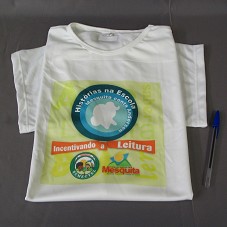 CAMISETA (TAM G) EM MALHA BRANCA, DE MANGA CURTA. NA FRENTE, ESTAMPA COM A INSCRIÇÃO 'HISTÓRIAS NA ESCOLA / MESQUITA CONTA ANDERSEN / INCENTIVANDO A LEITURA / PREFEITURA MUNICIPAL DE MESQUITA / SEMECTEL', COM RESPECTIVAS LOGOMARCAS.