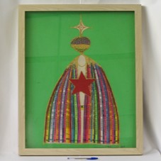 QUADRO (61X74,5 CM) COM MOLDURA TIPO CAIXA, EM MADEIRA CLARA E TAMPO DE VIDRO. POSSUI FUNDO EM TECIDO VERDE E IMAGEM DE NOSSA SENHORA APARECIDA, CONFECCIONADA COM FITAS COLORIDAS 'LEMBRANÇA DE NOSSA SENHORA APARECIDA', E DETALHES EM PURPURINA DOURADA. NO CENTRO, UMA ESTRELA VERMELHA. NO CANTO INFERIOR DIREITO, ASSINATURA DA ARTISTA. ATRÁS, ETIQUETA COM INFORMAÇÕES SOBRE A ARTISTA PLÁSTICA.