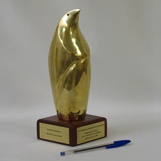 ESCULTURA EM BRONZE FUNDIDO, FIGURA DE UMA AVE (7X8X21,5 CM) NA POSIÇÃO VERTICAL, REPRESENTANDO O PROGRESSO E A ELEVAÇÃO. O BRONZE SIMBOLIZA O SOL E O CALOR QUE SUSTENTAM AS GRANDES REALIZAÇÕES. O VERDE DA ESMERALDA (OLHOS DA AVE) REPRESENTA AS FLORESTAS, OS RIOS E O MAR. A BASE (10X9,5X4 CM) EM PAU-BRASIL, SIMBOLIZA A VIDA E O SANGUE QUE CIRCULA NAS RAÍZES DA PERSEVERANÇA. EM CADA LATERAL DA BASE, UMA PLACA EM METAL DOURADO, COM AS INSCRIÇÕES: '19º CONGRESSO BRASILEIRO DE AVICULTURA / HOMENAGEM ESPECIAL / UBA - UNIÃO BRASILEIRA DE AVICULTURA / BRASÍLIA, OUTUBRO DE 2005'; 'PRESIDENTE DA REPÚBLICA / LUIZ INÁCIO LULA DA SILVA'; 'ESCULTORA PROF.ª M. GUILHERMINA / FONE: (62) 204-1709 / FAX: (62) 204-1708'; E, 19º CONGRESSO BRASILEIRO DE AVICULTURA / HOMENAGEM ESPECIAL / UBA - UNIÃO BRASILEIRA DE AVICULTURA / ABEF - ASSOCIAÇÃO BRASILEIRA DOS PRODUTORES E EXPORTADORES DE FRANGO / BRASÍLIA, OUTUBRO DE 2005'. ACOMPANHA FOLHETO COM INFORMAÇÕES SOBRE A PEÇA E A AUTORA. ACONDICIONADA EM SACO DE VELUDO PRETO, COM FITA DOURADA.