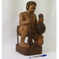 ESCULTURA EM MADEIRA (16X19,5X38 CM) MOSTRANDO UM HOMEM AJOELHADO, TENDO EM UMA DAS MÃOS, UMA CABAÇA; E, NA OUTRA, UMA FOICE. HÁ UM FACÃO NA CINTURA. NA PARTE POSTERIOR DA BASE, A INSCRIÇÃO 'ARY / TE-PI'.